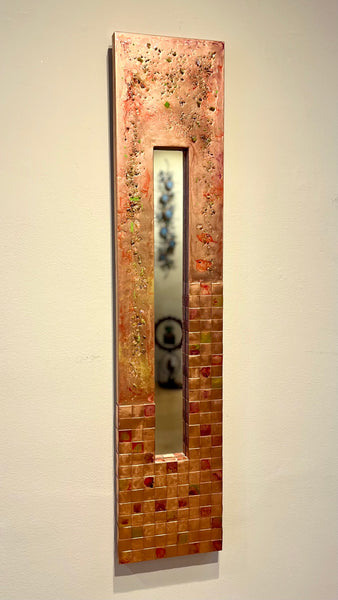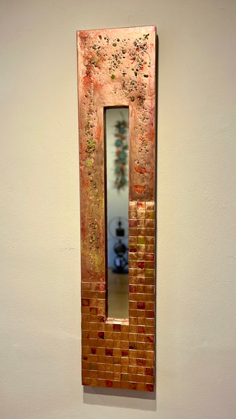 Hand-woven, hand-painted and patina, copper mirror. Each piece is uniquely colored with an artistic palette of paints, acids, verde-gris, and dyes. These functional art pieces are crafted by the couple Jean and Tom Heffernan from Arizona.