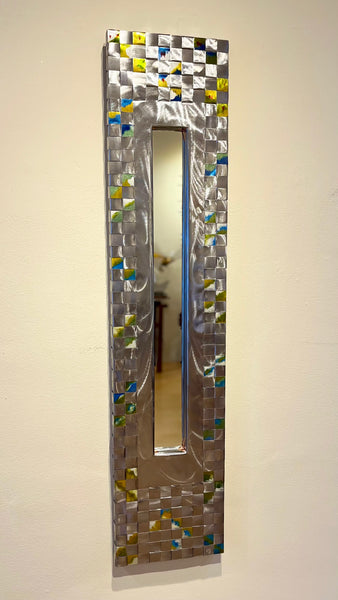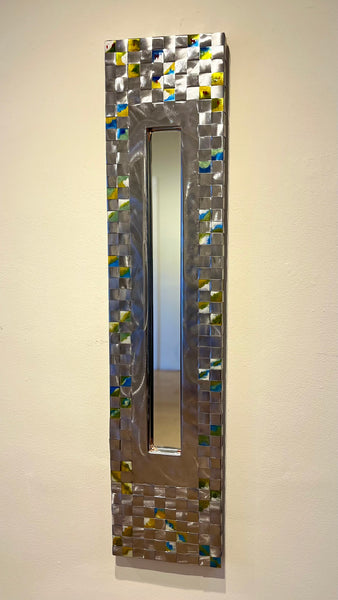 Hand-woven, hand-painted and patina, steel mirror. Each piece is uniquely colored with an artistic palette of paints, acids, verde-gris, and dyes. These functional art pieces are crafted by the couple Jean and Tom Heffernan from Arizona.