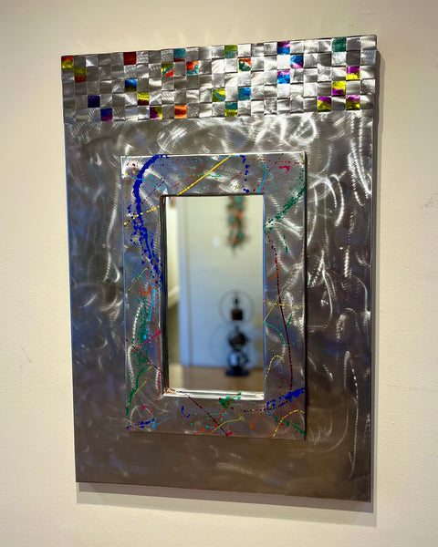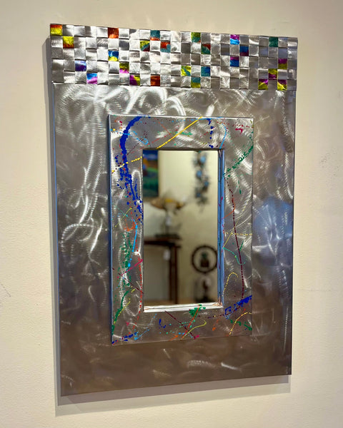 Hand-woven, hand-painted and patina, steel mirror. Each piece is uniquely colored with an artistic palette of paints, acids, verde-gris, and dyes. These functional art pieces are crafted by the couple Jean and Tom Heffernan from Arizona.