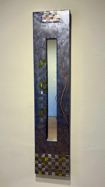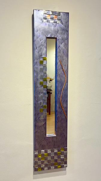 Hand-woven, hand-painted and patina, steel mirror. Each piece is uniquely colored with an artistic palette of paints, acids, verde-gris, and dyes. These functional art pieces are crafted by the couple Jean and Tom Heffernan from Arizona.