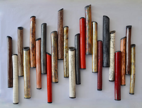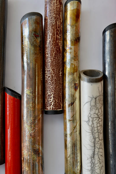 The process begins with clay that is sculpted into a cylindrical forms. The work is then glazed and ready to be fired. The kiln is loaded and brought to a temperature of 1800 degrees Fahrenheit. Once fired; the pieces are placed into reduction bins with sawdust, paper, and other combustible materials. The bins are closed airtight, allowing the work to go through the reduction process. This process allows the glazes to reach all the colors within their spectrum.