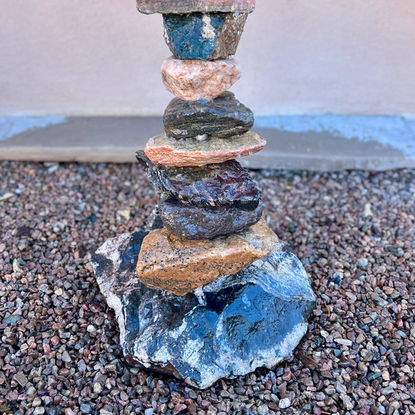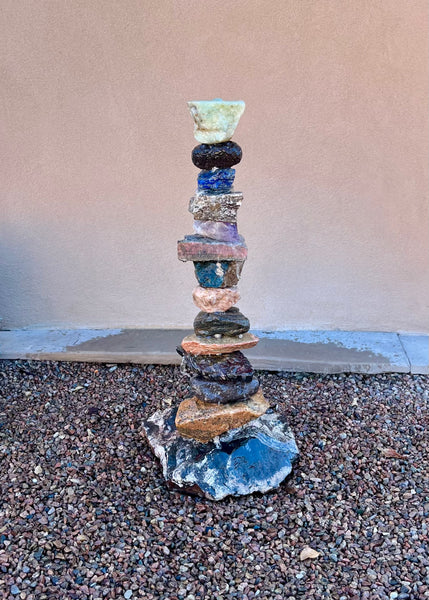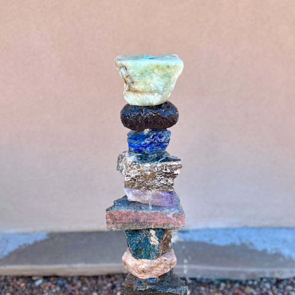 Each stone is hand-cut and drilled by the artist. Gerald uses exotic and rare stones, including; Onyx, Marble, Quartz, Travertine, Lava Rock, and Geodes. The stones are mounted on a Stainless Steel Pipe. The stones can be rearranged and stacked to create your own unique rock formation!