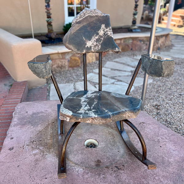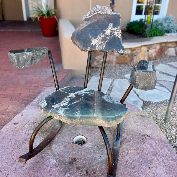 Hand-carved and polished, these functional stone furniture pieces aren't just great to look at, they are comfortable! Gerald travels many miles down the Sea of Cortez coastline to find these special rocks for his chairs. These beautiful stones are a combination of granite and marble with veins of onyx. The steel frames are formed by hand and custom shaped to fit each unique stone.