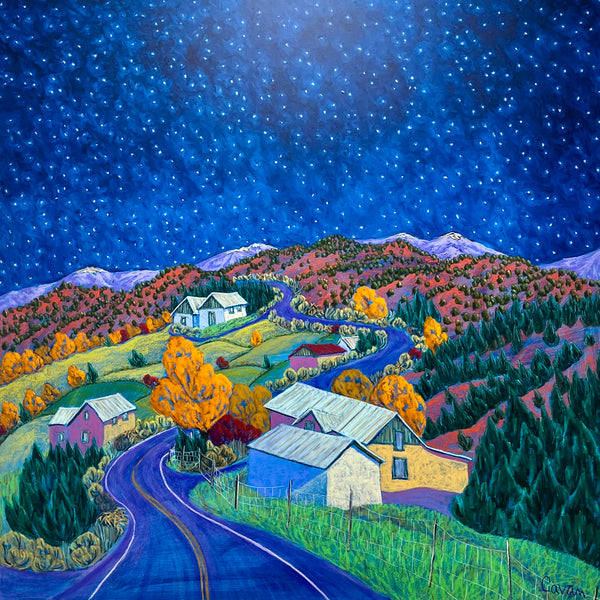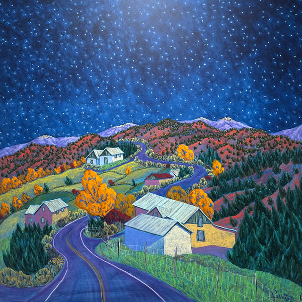 Relying on photographs, sketches, and memories of places Jennifer has found on the back roads of New Mexico, she uses vibrant, saturated colors, bold compositions and slightly altered perspectives to present, rather than represent, this special place. Jennifer uses a spray fixative and brush-on acrylic resin varnish to stabilize and protect the painting from UV light.