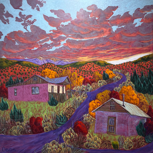 Relying on photographs, sketches, and memories of places Jennifer has found on the back roads of New Mexico, she uses vibrant, saturated colors, bold compositions and slightly altered perspectives to present, rather than represent, this special place. Jennifer uses a spray fixative and brush-on acrylic resin varnish to stabilize and protect the painting from UV light.