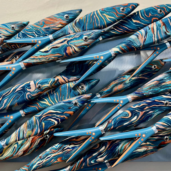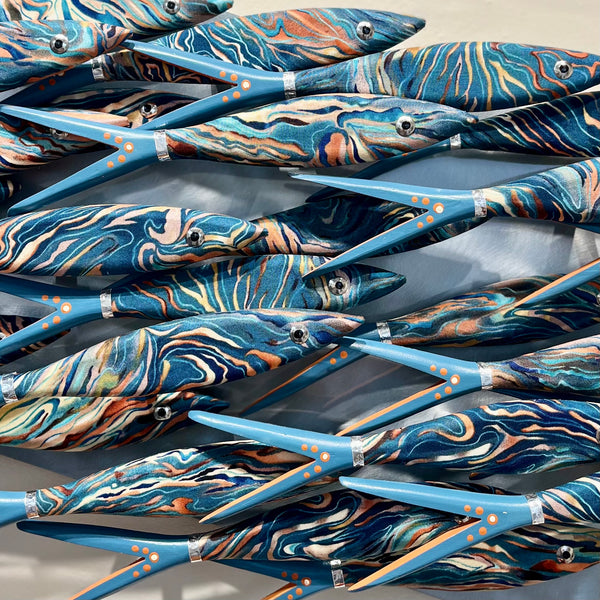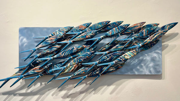 Inspired by the BBC Blue Planet documentary series; Betsy and Tiffany Shaw reproduce the natural occurrence of schooling fish chased to the sea surface. This dimensional and sculptural art is interactive, as each fish is individually mounted to the steel plate with a magnetic post. Shaw's interactive art allows the client to indulge their own creativity and design your own unique, "school-of-fish."