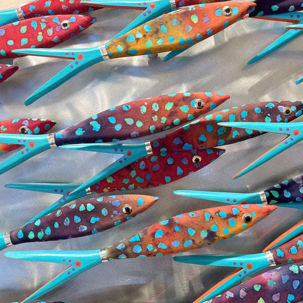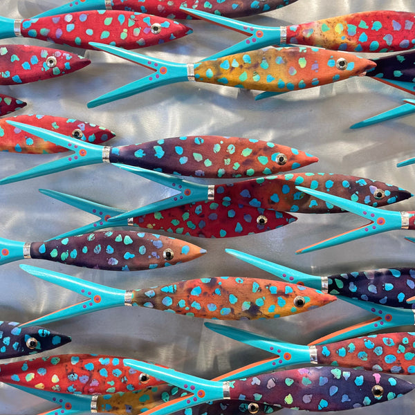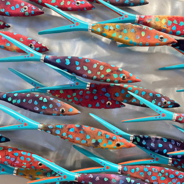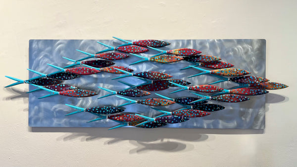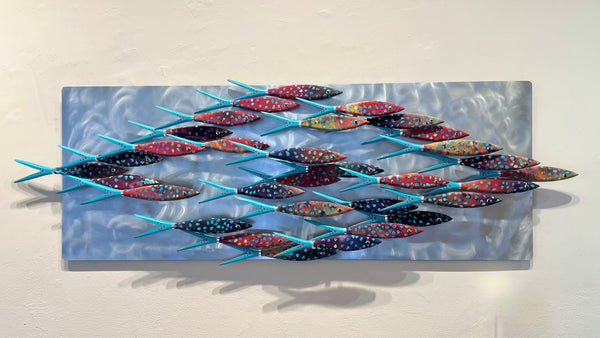 Inspired by the BBC Blue Planet documentary series; Betsy and Tiffany Shaw reproduce the natural occurrence of schooling fish chased to the sea surface. This dimensional and sculptural art is interactive, as each fish is individually mounted to the steel plate with a magnetic post. Shaw's interactive art allows the client to indulge their own creativity and design your own unique, "school-of-fish."