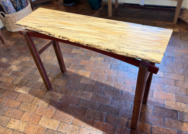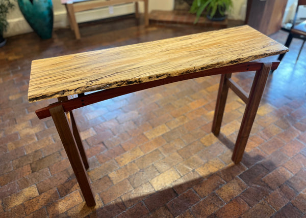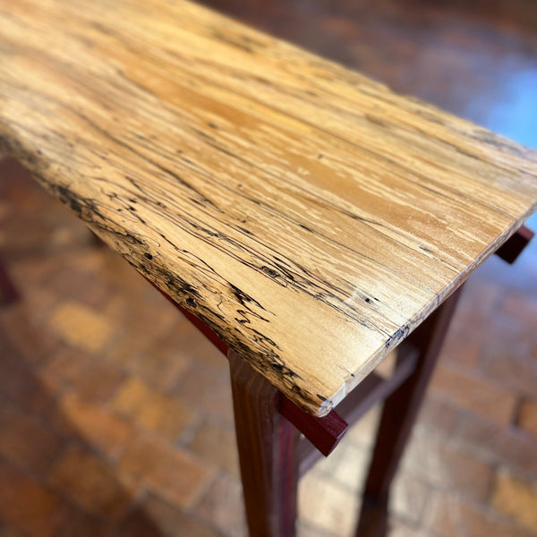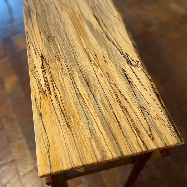 A brilliant piece of Spalted Maple is floating elegantly on two Padauk arched supports, connected to the legs with compound dado joints. The hand planed legs are made of Walnut with a Padauk center layer. Round flush Wenge plugs adorn the front arched support.