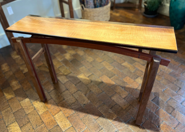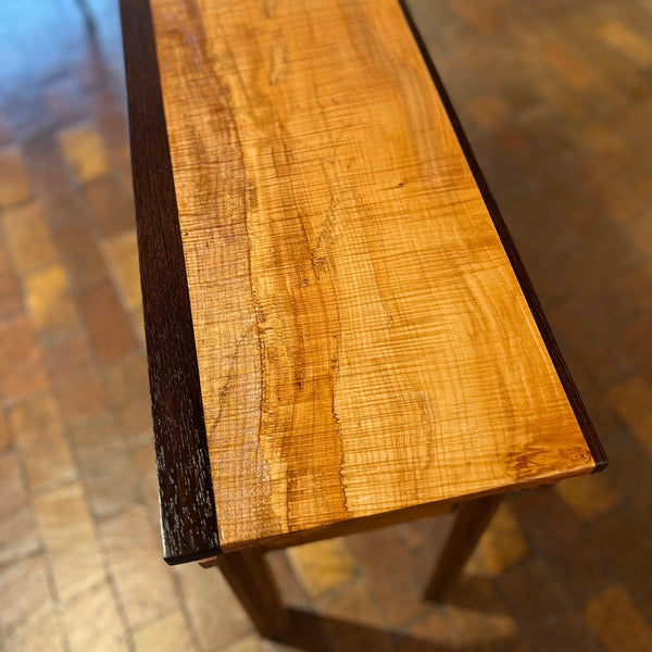 A rich Spalted Curly Maple top is floating elegantly on two Padauk arched supports, connected to the legs with compound dado joints. The hand planed legs are made of Walnut with a Padauk center layer. Round flush Wenge plugs adorn the front arch and Wenge back and front accent pieces on top give this table a detailed finished look.