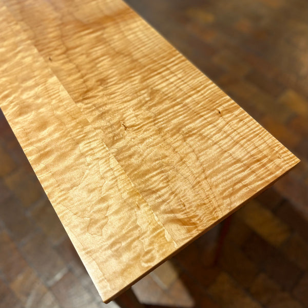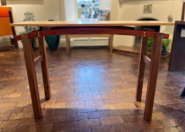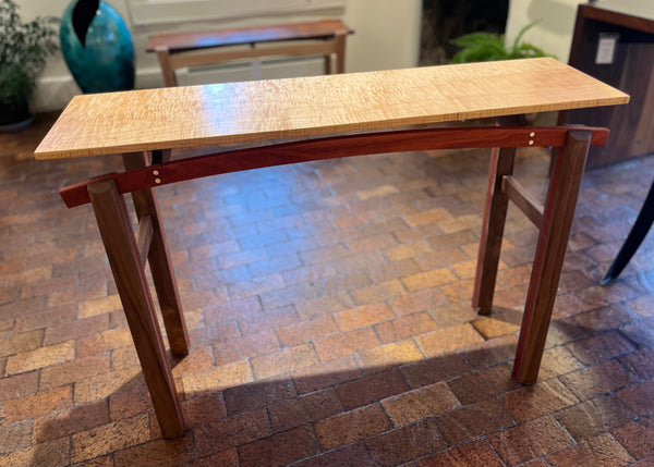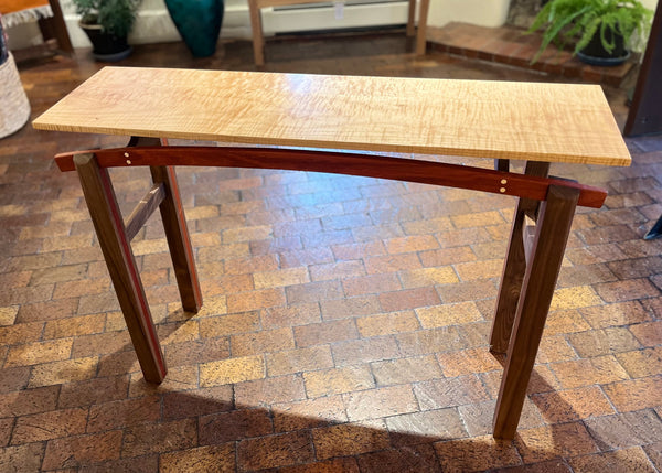 A rich Curly Maple top is floating elegantly on two Padauk arched supports, connected to the legs with compound dado joints. The hand planed legs are made of Walnut with a Padauk center layer. Round flush Maple plugs adorn the front arch and Maple back and front accent pieces on top give this table a detailed finished look.